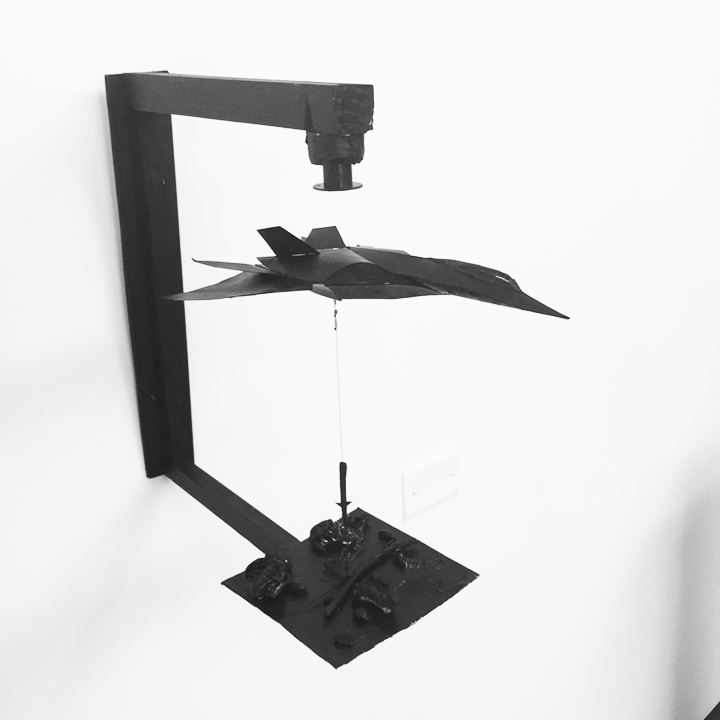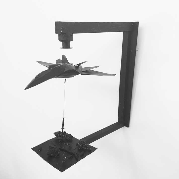 This piece was made with paper and acetate, a magnet is responsible for the elevation.
